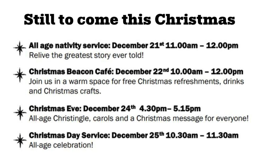 Thursday 18th December 2.00 -4.00pm Christmas Craft group with Christmas refreshments and warm welcome space in church building. Come to some or all of it. Speak to Karen, Lesley or myself for more information or if it’s something you might be able to join or support as we are looking for helpers.