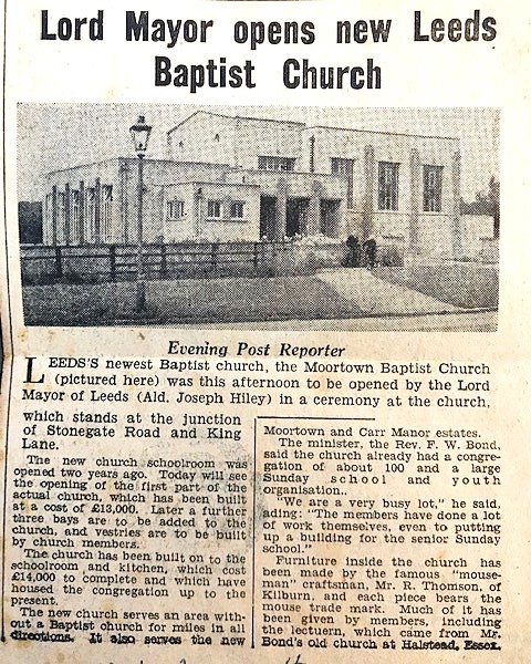 In October 1957 and just two years on from its formation the Lord Mayor of Leeds, Ald Joseph Hiley, officially opened Moortown Baptist Church.