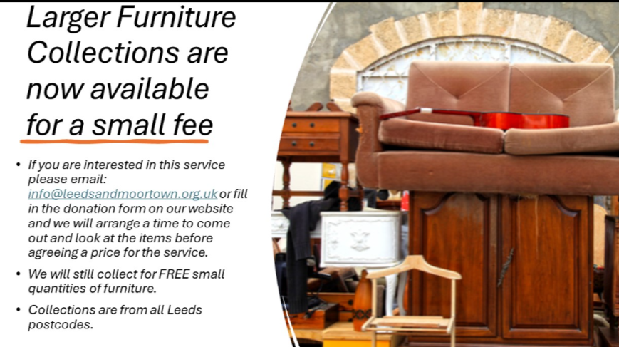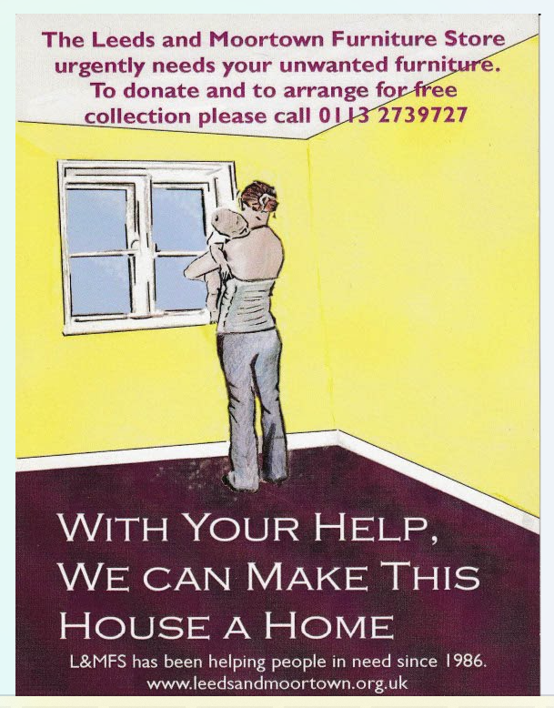 To keep things simple, can we suggest that if you do ever find yourself in that situation you contact the Leeds and Moortown Furniture Store, a registered charity with forty years experience of fighting furniture poverty.