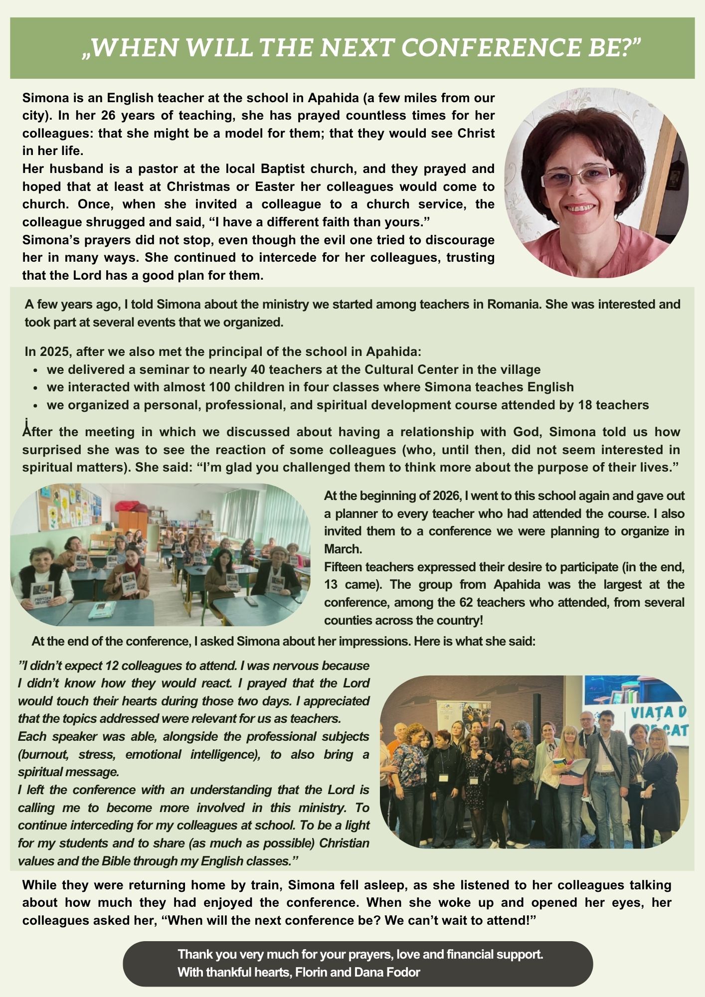 Florin and Dana Fodor report from Romania how God has been at work- touching lives, building community, and inspiring teachers